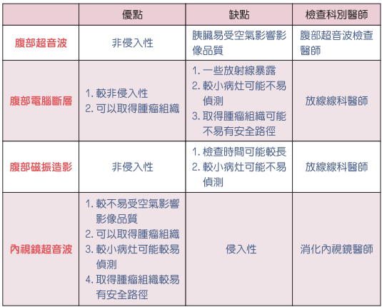 除了症狀外,檢驗檢查也是診斷癌症必須的,針對胰臟癌的腫瘤指標目前最常被使用的是醣類抗原19-9(CA19-9)和癌胚胎抗原(CEA),不過兩者都不是針對胰臟癌特異性的抽血檢驗。檢查可分為非侵入性及侵入性的方式,非侵入性方式有腹部超音波、腹部電腦斷層(CT)、腹部磁振照影(MRI);而侵入性的方式有內視鏡——內視鏡超音波(Endoscopic Ultrasound EUS)。以下是檢查方式的比較